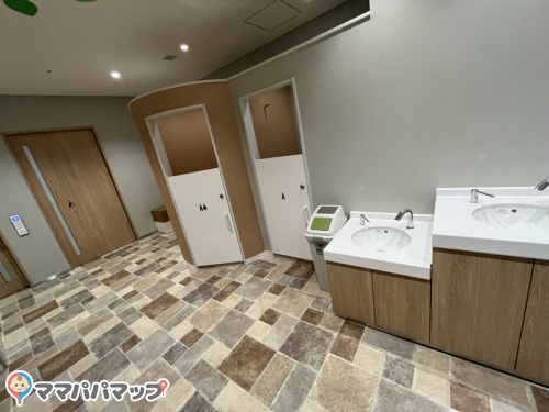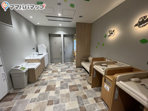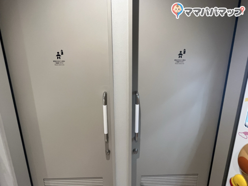 スペースすぐ横に多目的トイレもあるので、1人が赤ちゃんのおむつ替えをしている間、もう1人がトイレに行ったりできて便利です。
