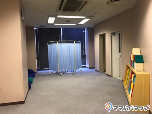 カーペットの部屋で、靴を脱いで上がります。奥にパーテーションと授乳用の椅子が一つあり、静かに授乳することがあります。