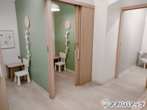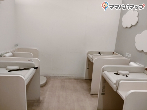ねんね用のおむつ台が3台・タッチ用が1台、調乳の設備、授乳室が3部屋。オムツ用のゴミ箱設置してあります。広めのソファもあり、夫や実母もリラックスして待機していて貰えました。