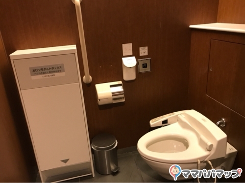 奥の個室2個にオムツ台、オムツ用ダストボックスあり