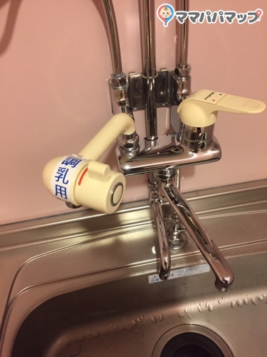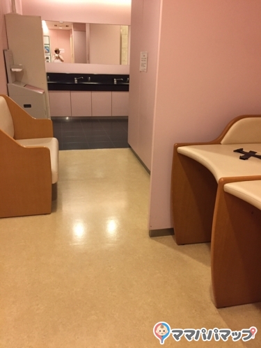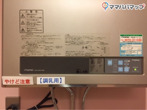 入り口から、調乳器・流し、オムツ台×2、授乳室×2