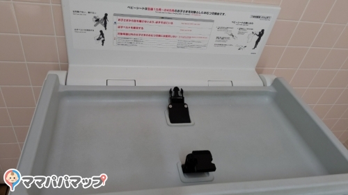 女性用トイレは個室の外にオムツ台があり、個室の中はかなり広いのでベビーカーごと入れます。